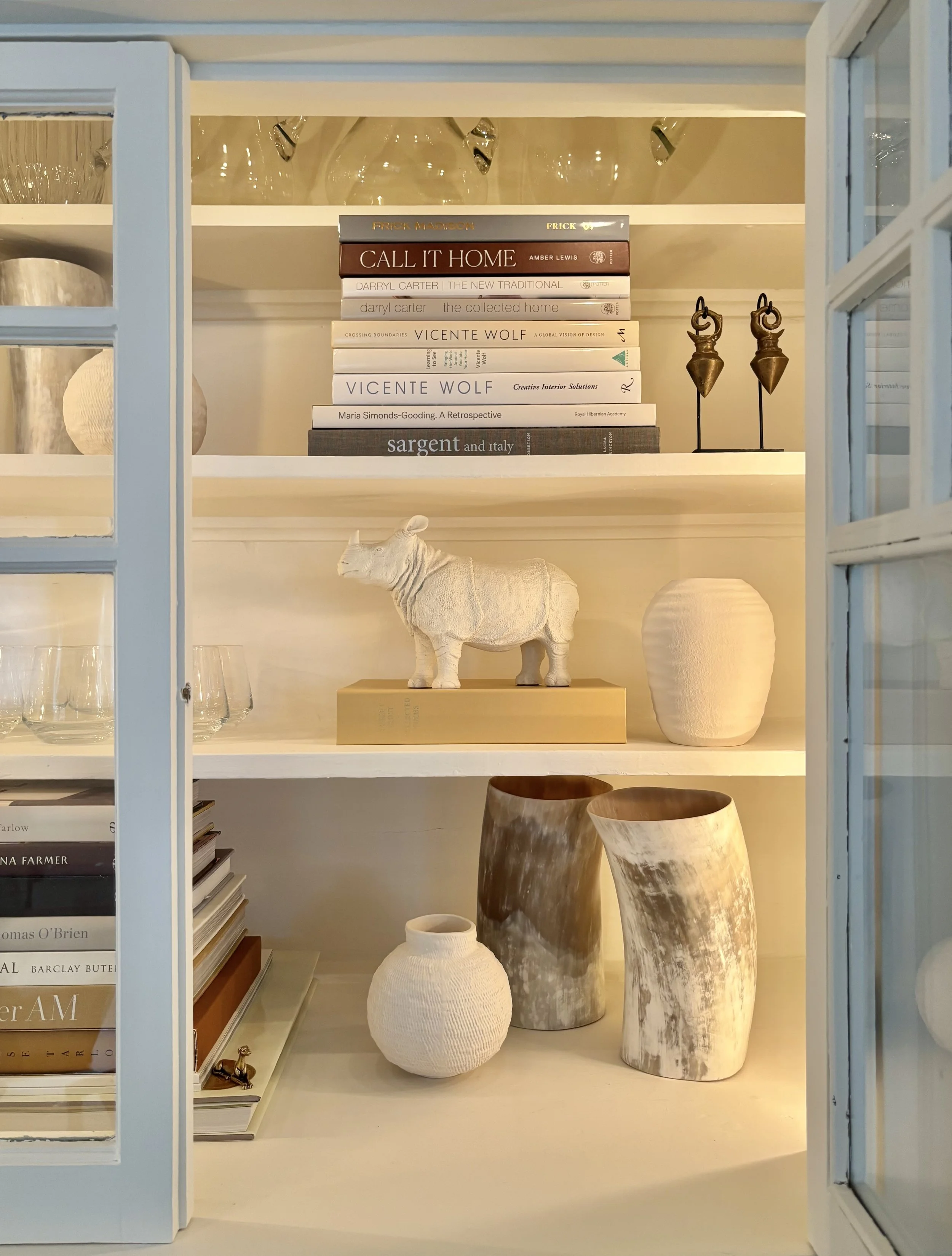The furniture, art, and objects have been thoughtfully collected and curated over the past few decades. Fauteuils from the 1940s lovingly stripped and reupholstered in a creamy white cotton look right at home around a modern pedestal table in the dining room. A similar story applies to the vintage pair of barrel-back chairs seated in front of the custom travertine fireplace. Simple, yet with an elegant form, they seamlessly marry the dining room into the adjacent living room. Perhaps the most coveted acquisition is a pair of vintage fluted column tables. Their classical form, reimagined with a natural wood patina, is the singular inspiration for this home’s incandescent color story. Lastly, it is the unexpected love affair of a 19th-century bergère and a pair of artisan-made ceramic wings that takes my breath away. Distinctly different pieces, that were purchased years apart and worlds away from one another, miraculously united as one. Each and every piece has its own personal story along with a cherished memory: the town, the shop, who I was with, and its journey during my lifetime. It’s like living with old friends...I’ve known them for most of my life.