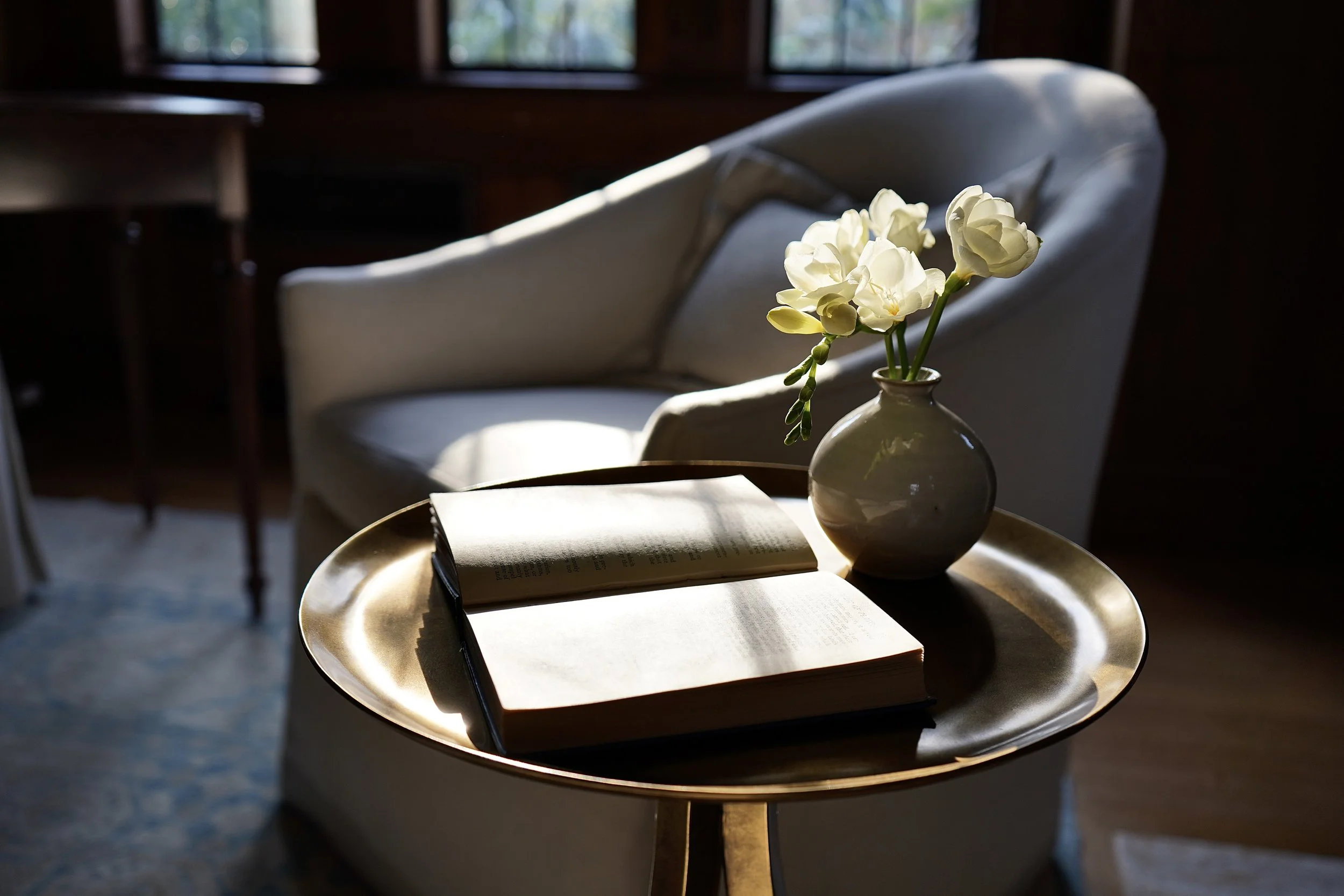 As a counterpoint to the home’s original decorative beams and paneling, the custom upholstered pieces provide a refreshing balance of yin and yang. Dark and light, hard and soft, masculine and feminine— they are not static opposites but rather dynamic forces that interact, transform into each other, and maintain a state of dynamic equilibrium. Subtle touches of brass and stone, along with a curated collection of vintage books, offer an additional layer of interest. Elegant, calm, and comfortable, this home is an ethereal mix of old and new.